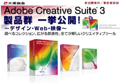 待望のクリエイティブデザインツール「Adobe Creative Suite 3」 日本語版が遂にデビュー! ということで全製品をセミナー形式で紹介するイベントを大塚商会さんがやってくれるそうです。