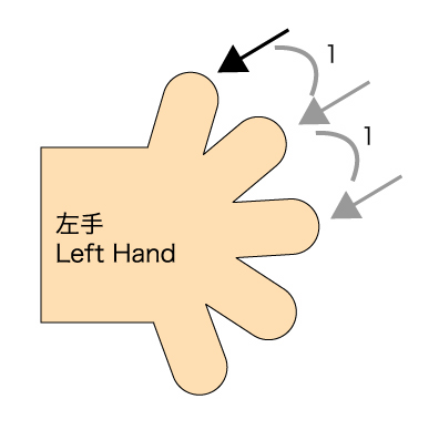 例)親指からスタートして、人差し指>中指>薬指>小指>薬指