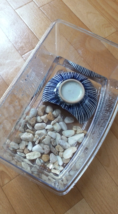 ザリガニを飼うのは初めてなので、飼育方法をググってみたところ、「ザリガニは臆病なので、隠れるところを作ってあげてね」とあったので、ちょうど雅空がこわした茶碗があったので、新居として誂えてみました。