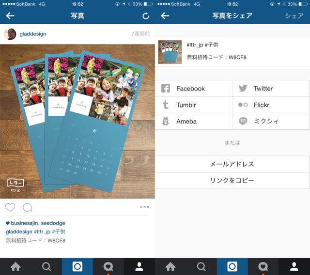 レターアプリ自体からInstagramなど他のアプリへ渡してシェアすることもできる。