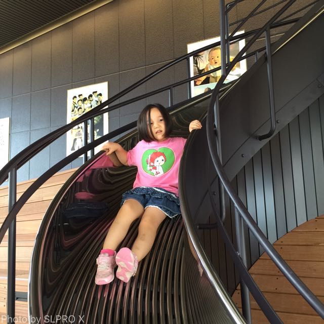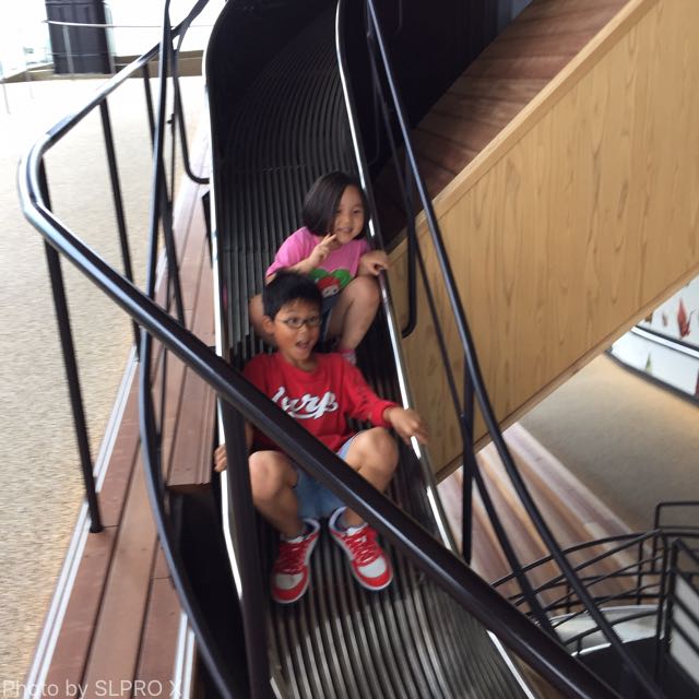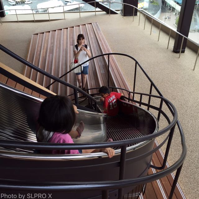 展望フロアから下へは螺旋階段で降りる。途中には滑り台があるなど遊びゴコロが満載(非常階段としての機能もあるらしい)。