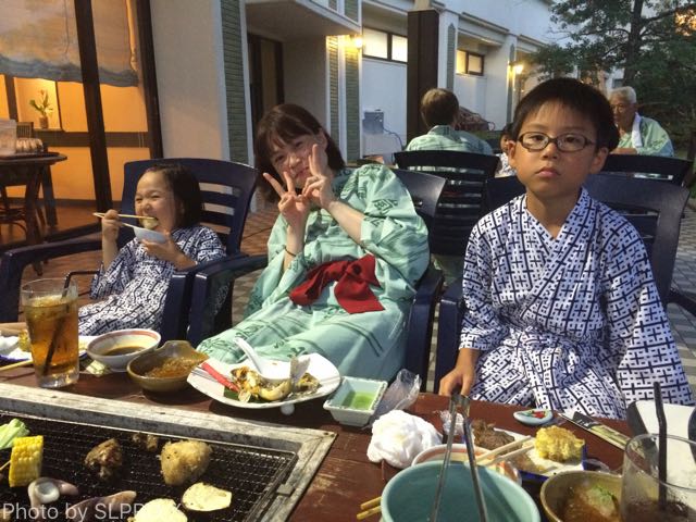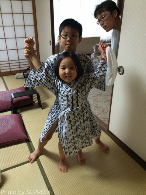 夕食の前に温泉へ。子ども用の浴衣が丁度いいですな。