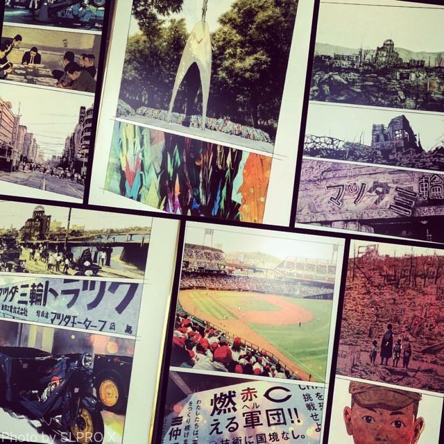 螺旋状のスロープの壁では漫画家・佐藤秀峰さんのイラストが展示してあった。広島の歴史を様々なカットで描き、漫画的に表現。下から登りながら見ると時系列に並んでいる(今回私たちは上から降りたので時代をさかのぼる順で見た)。