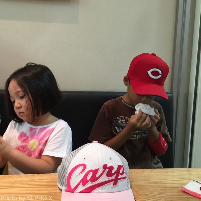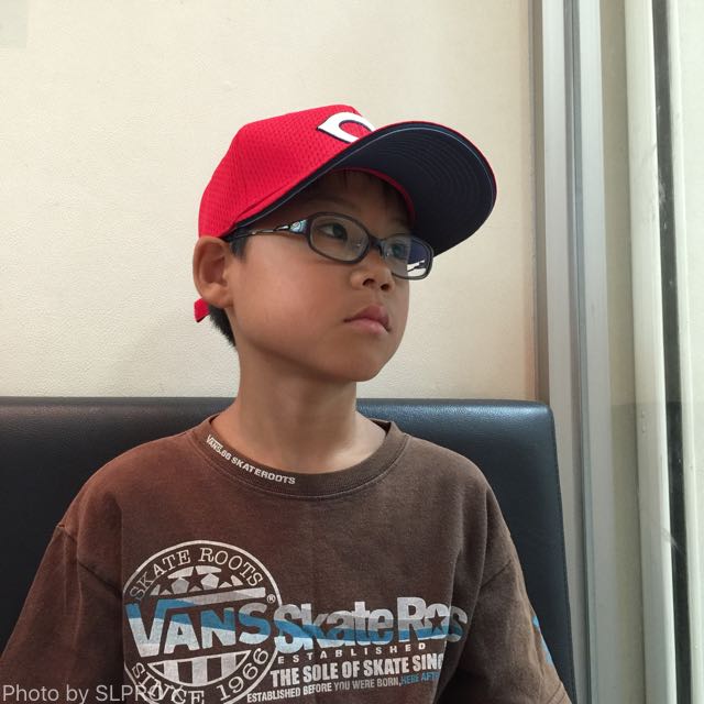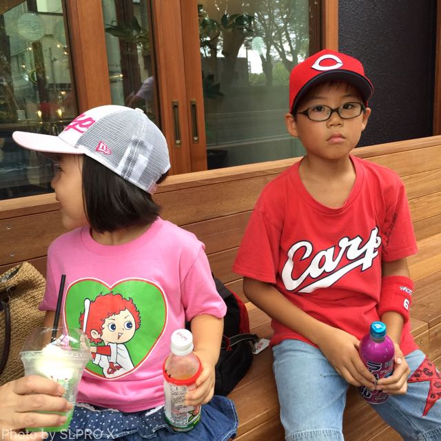 カープの野球帽で赤いTシャツ。完全に地元の子スタイルなガクさん。