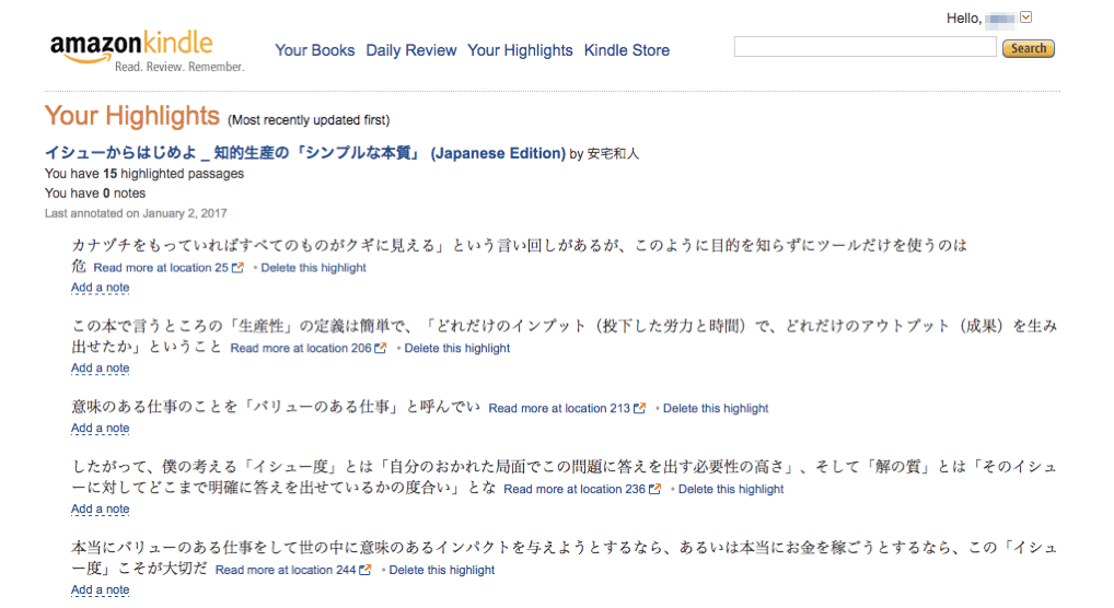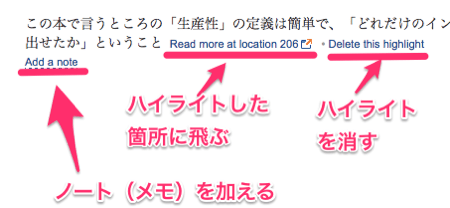 さらにkindleだとマーカーを引いた箇所(=ハイライトした箇所、と言います)をあとからPCなどで一覧化したり、テキストとしてコピペできたりするので、読書メモをまとめるには好都合。
