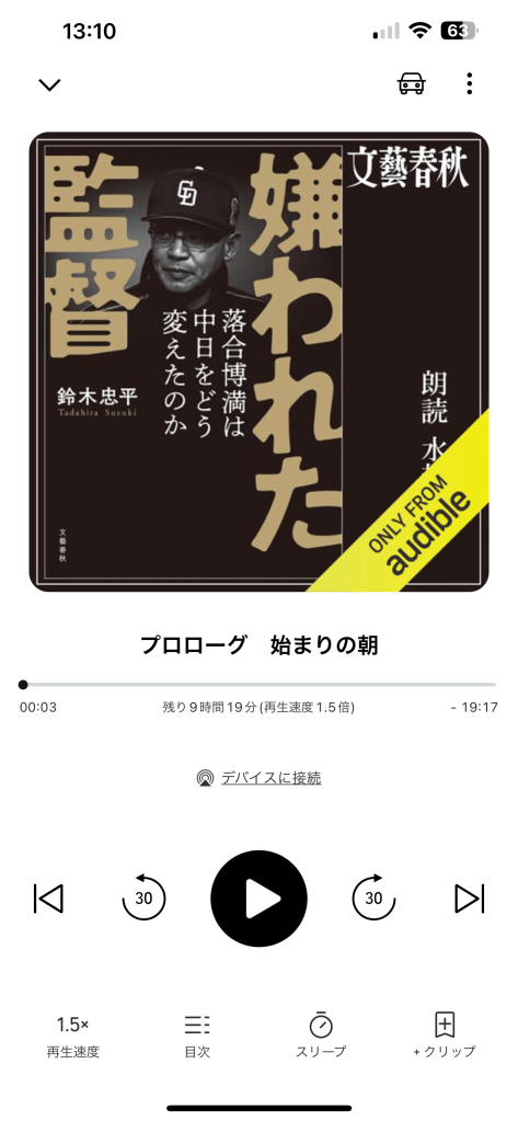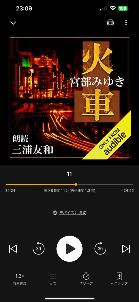 自分が紙の本を読む時には、どれくらい時間がかかるかなどあまり気にしたことはなかったが、こうして明確に聴き終えるまでの残り時間が表示されると、読み始めの時にはとてつもなく長い時間が表示されるので、少々面食らった。