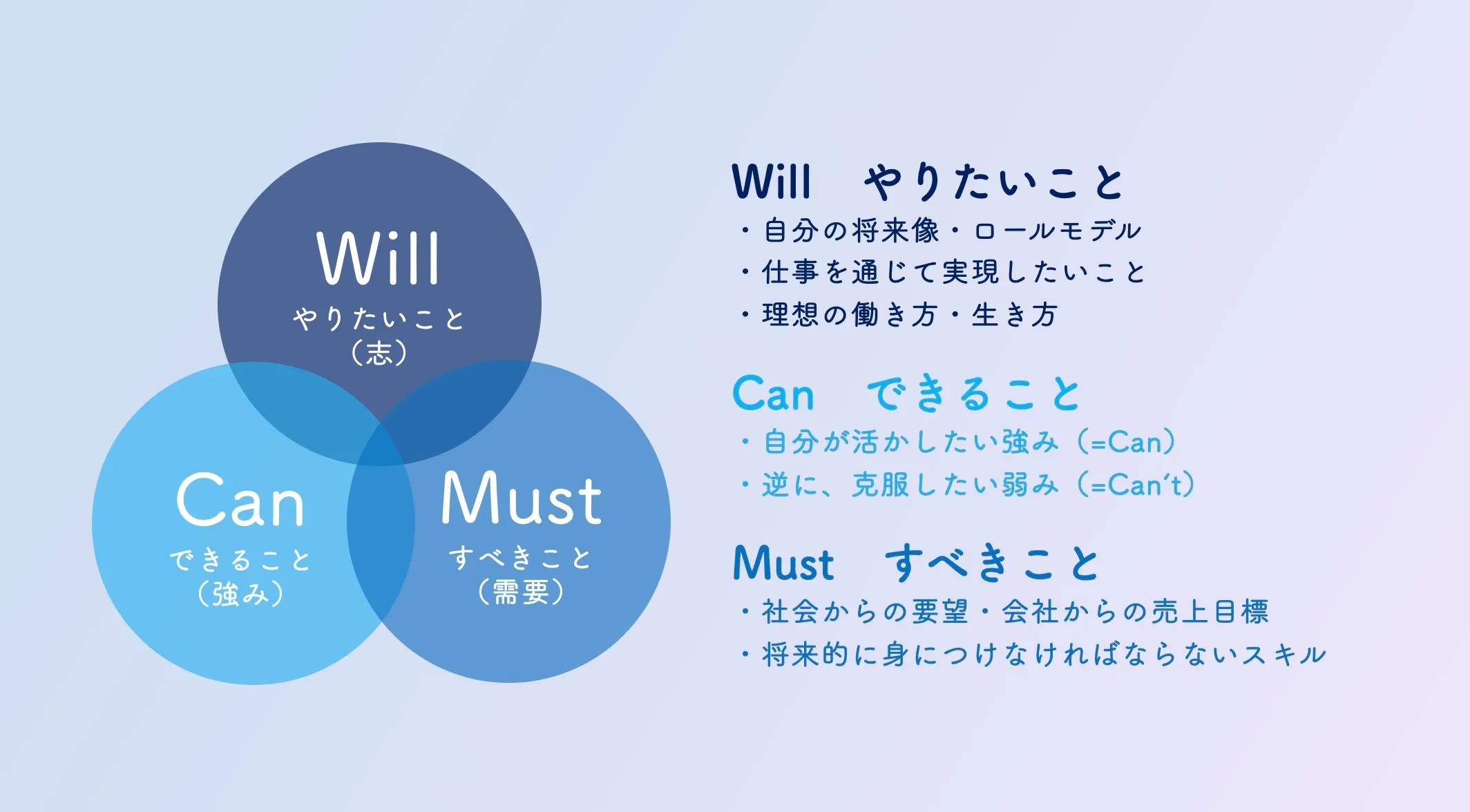 大学生に就活支援をしていた頃、いわゆる就活用語で「Will・Can・Must」の話をしたことがある。