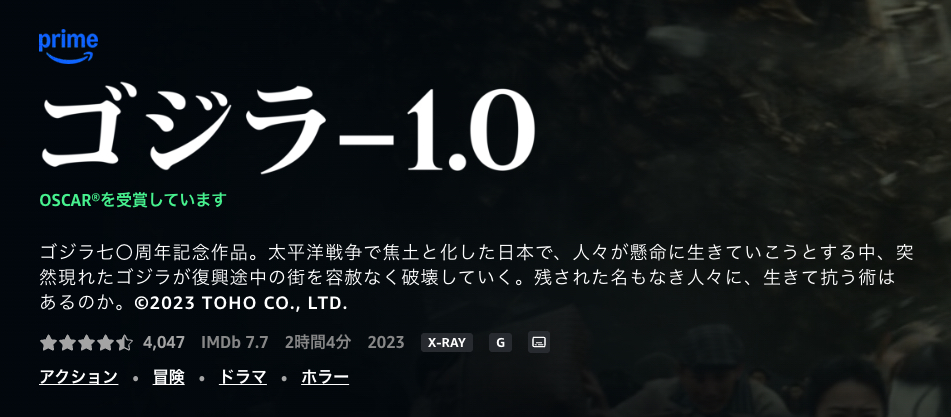 本作は、2024年3月、日本の作品としては初めて米国アカデミー賞の視覚効果賞を受賞した。